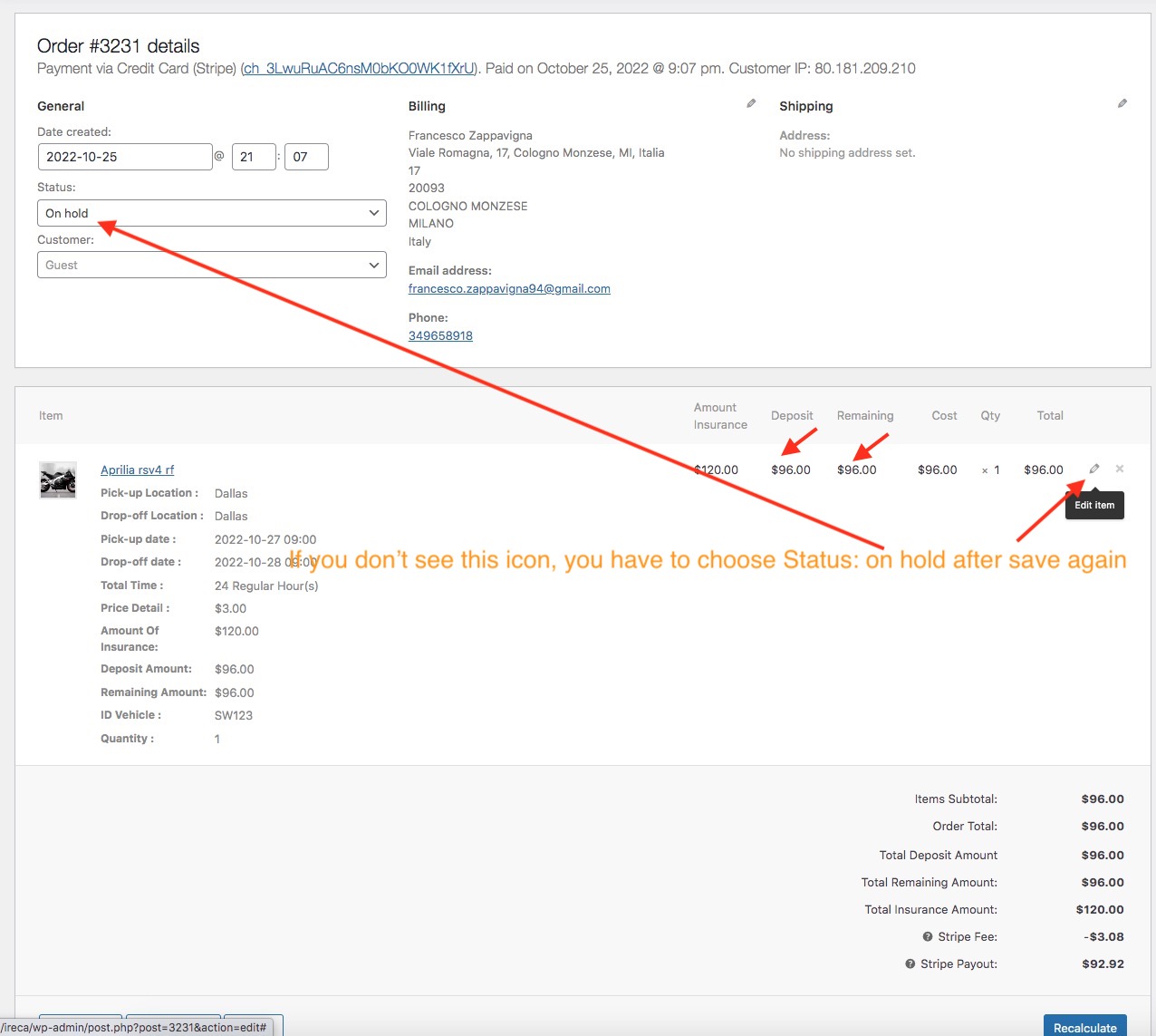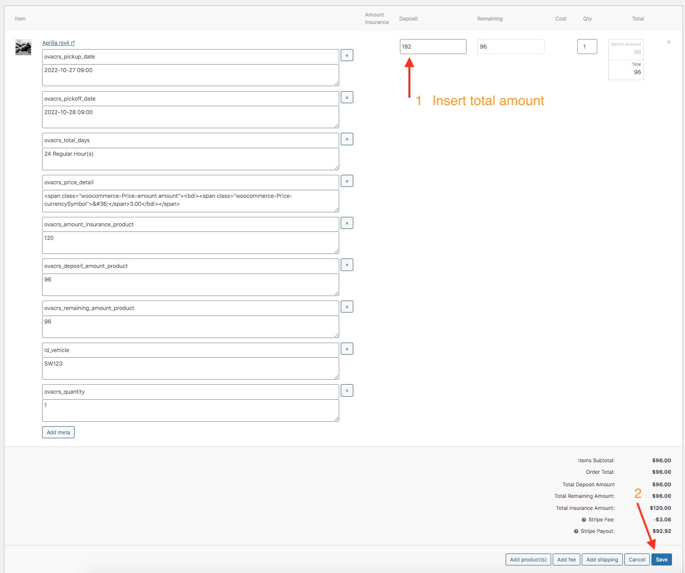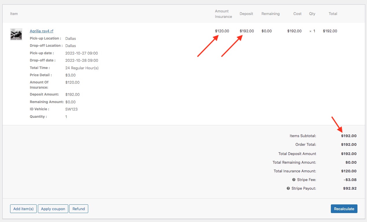 The customer booking a vehicle and deposit (example 50% total amount), the customer to agency to receive vehicle and pay remaining amount. You will find info of customer in above Manage Booking and click Order ID, you will see detail in order like here: